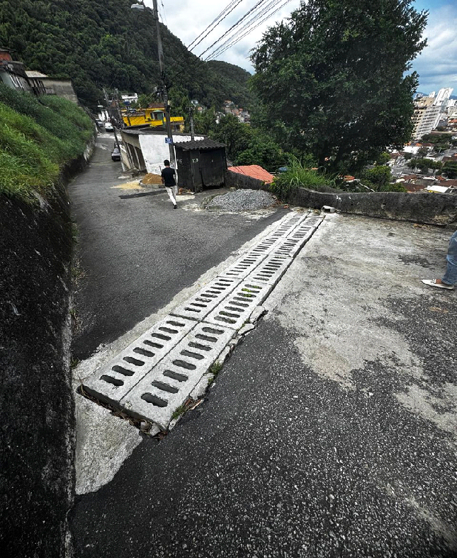 Na Rua 9, também no Morro Marapé, houve reforma da canaleta lateral. Na Rua 2, foi implantada a canaleta com grelhas para a captação das águas pluviais.